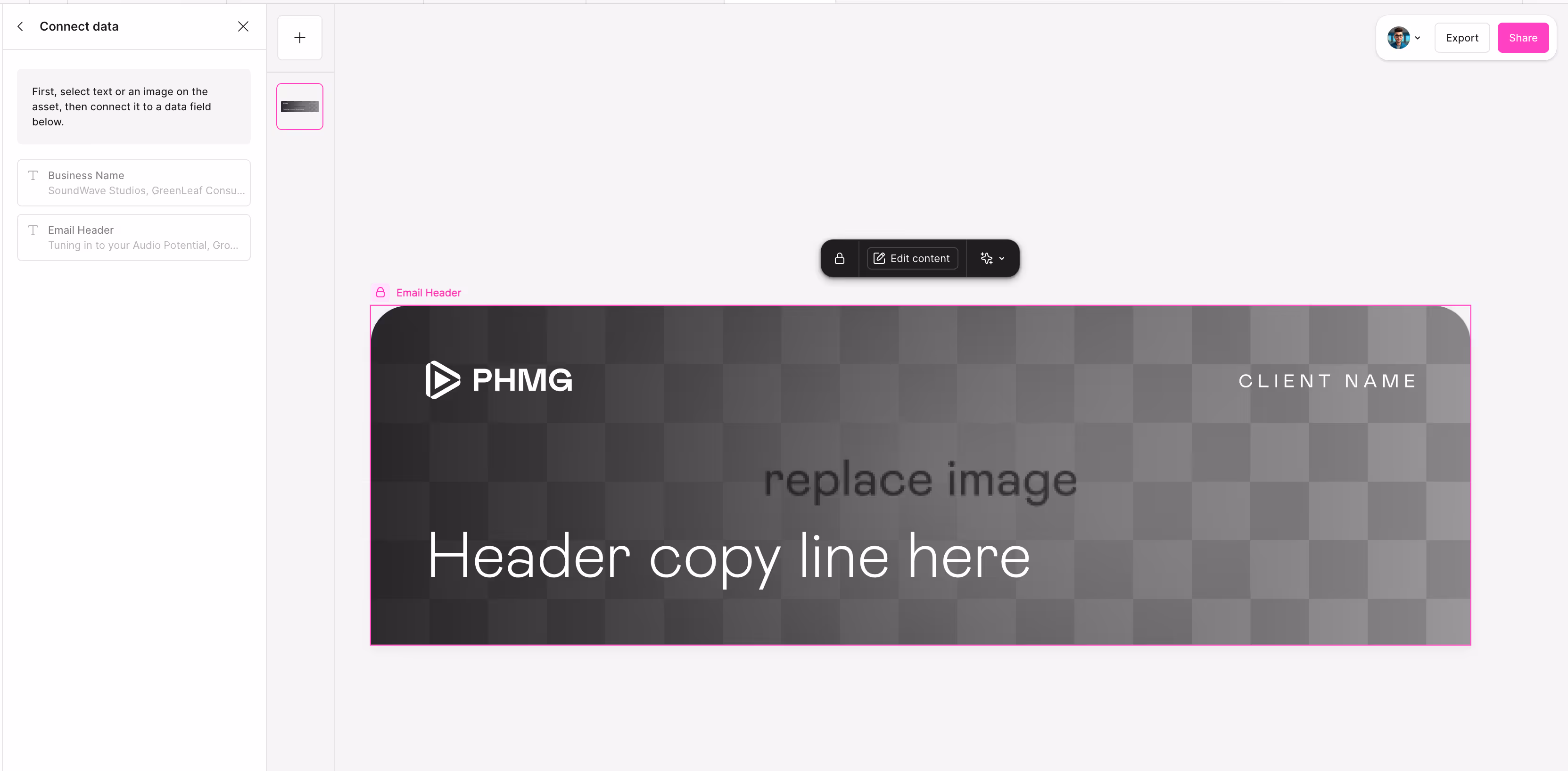 Source your image from the lead's website or other custom source, making sure to check image quality and ensure it's high resolution to avoid pixelation in the final output. The image needs to be a minimum size of 600px × 185px.