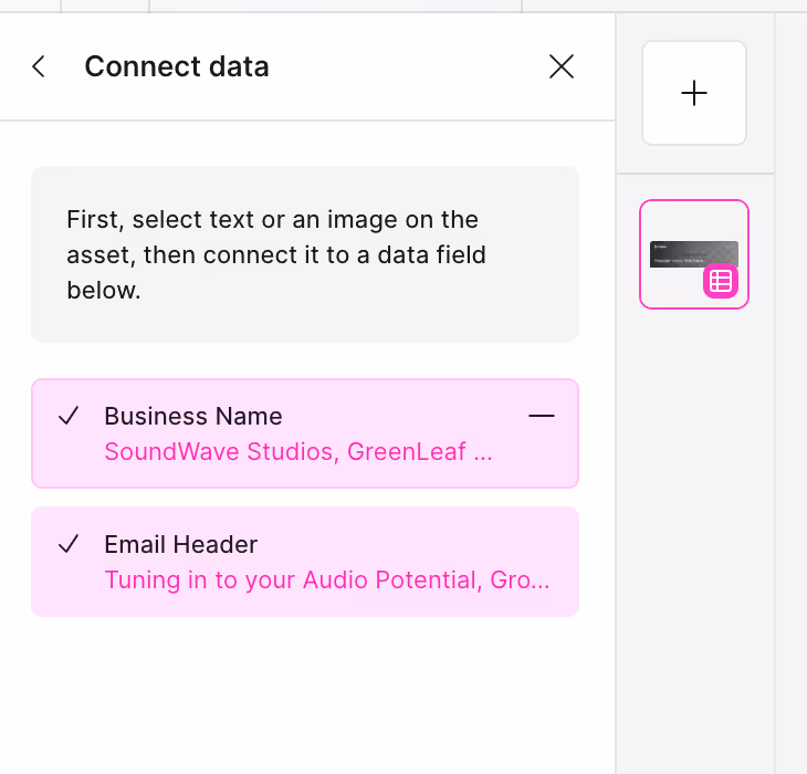 Click on this text on the design, and then click the corresponding option in the left panel. When linked, they should turn pink with a tick